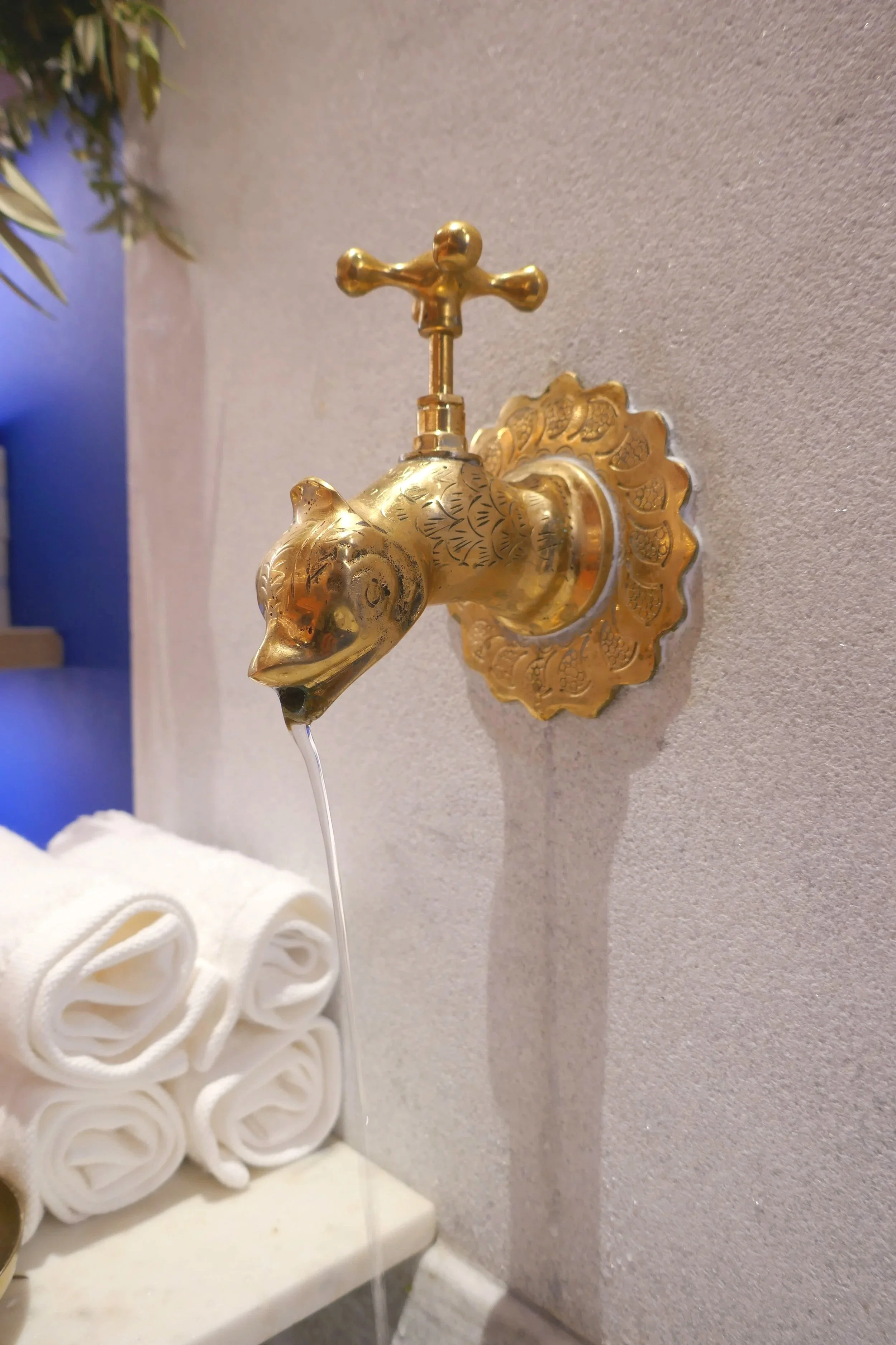 The marble fountain recalls the welcoming yard of the Archondariki, where guests are received with coffee and loukoumi.