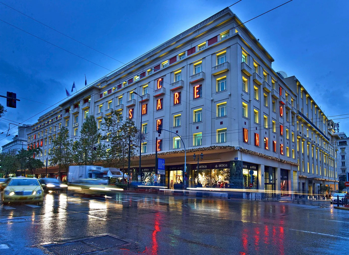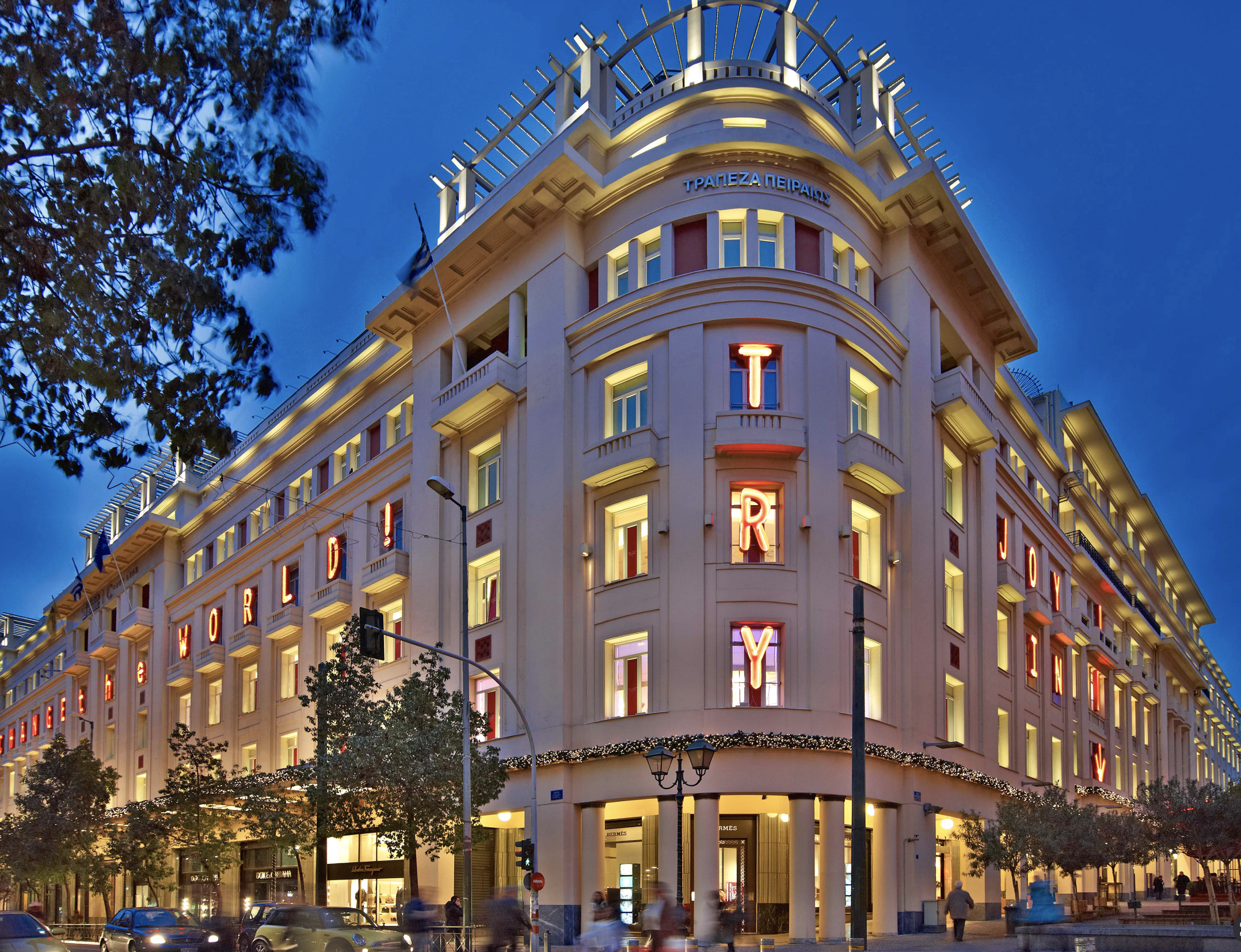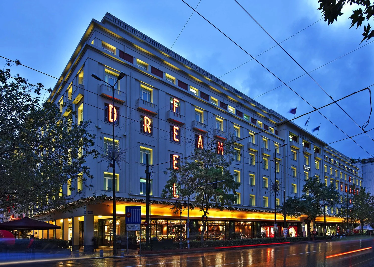 The exterior was activated through bold typographic prompts and a continuous illuminated garland, establishing the building as a communicative surface within the city. Drawing from the warm, boxed neon language of the neighbouring theatres, the intervention embedded itself within the existing urban character while asserting a contemporary graphic presence.