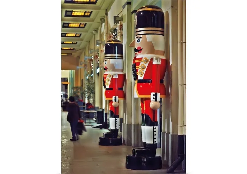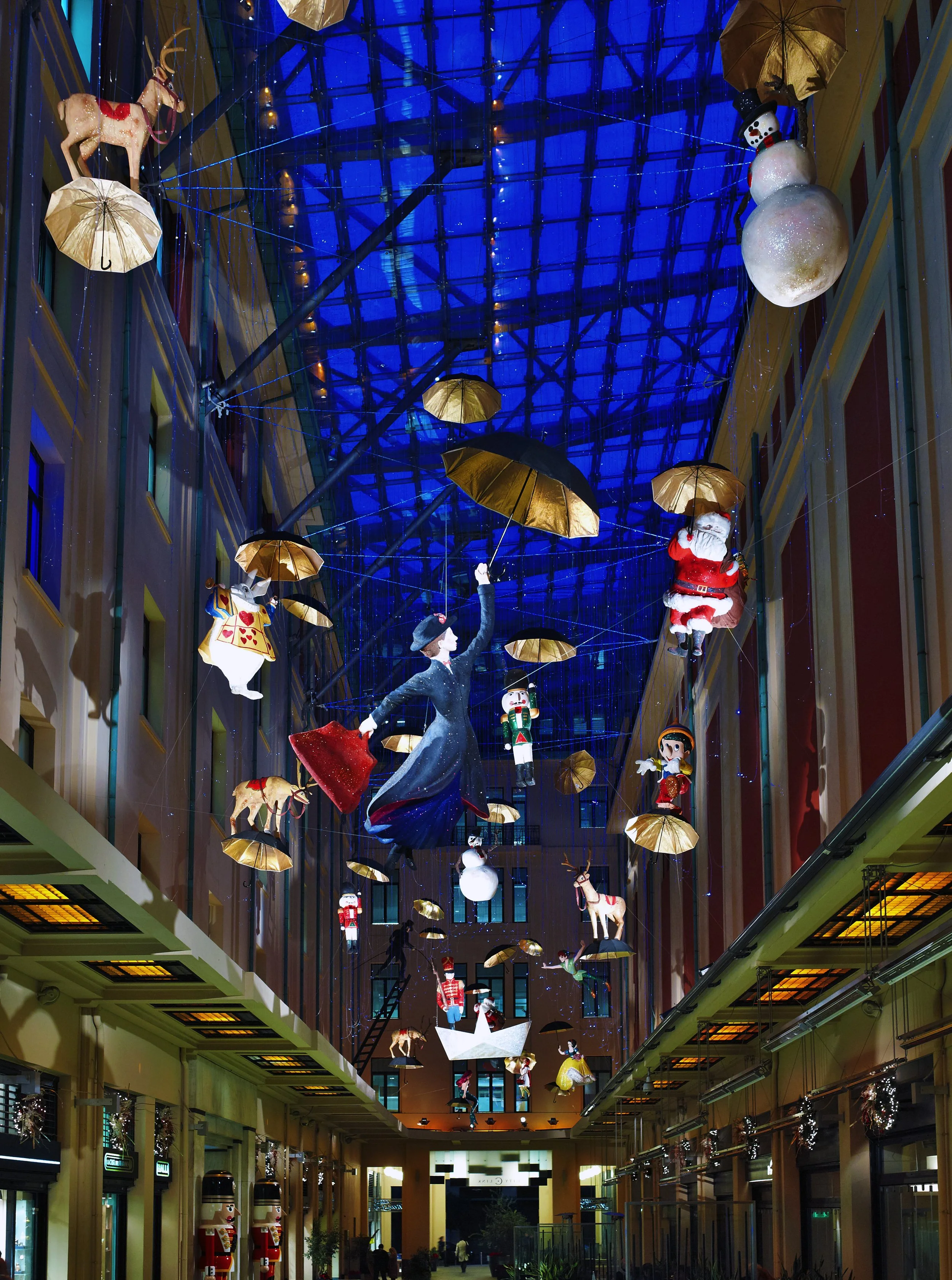 Inside the arcade, suspended archetypal figures -handcrafted by national theatre sculptors- descended through layers of fibre-optic rainfall. The spatial composition formed a slow vertical procession above visitors, creating an immersive environment that balanced wonder with architectural order. Recognisable archetypes drawn from shared cultural memory were used not illustratively, but as narrative anchors within a broader experiential system.